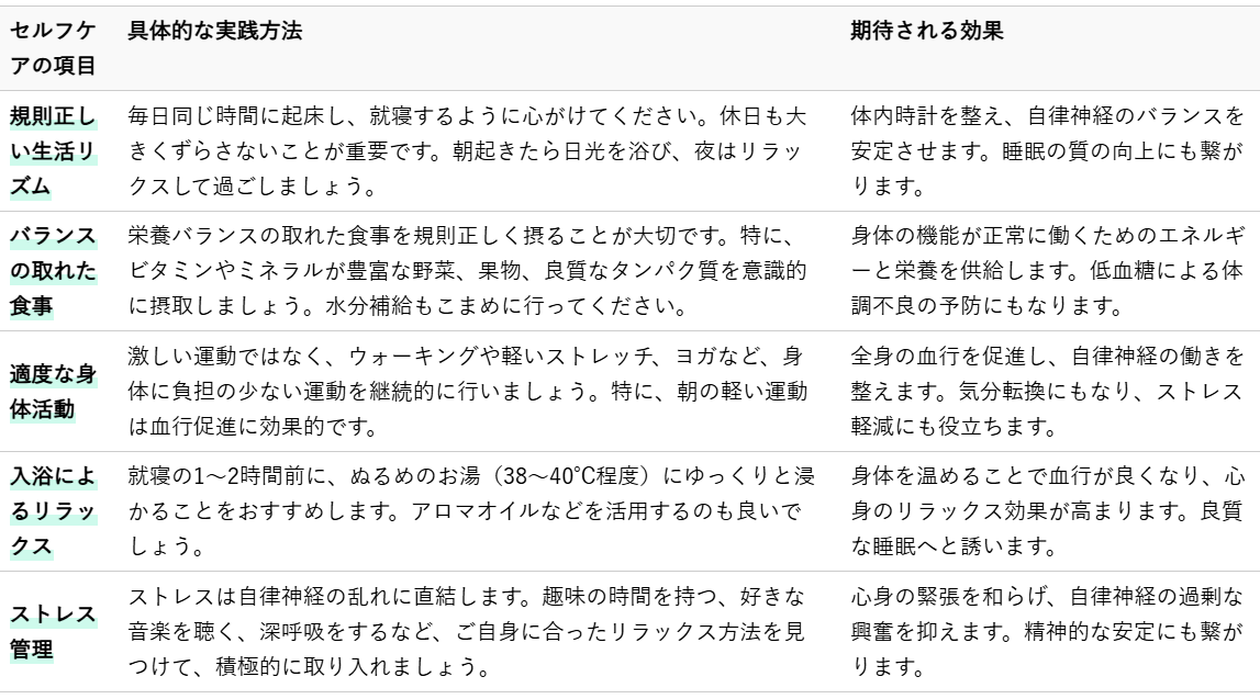 これらのセルフケアは、自律神経の安定化、血流の改善、そして心身のリラックスを促すことを目的としています。無理のない範囲で継続することが大切です。