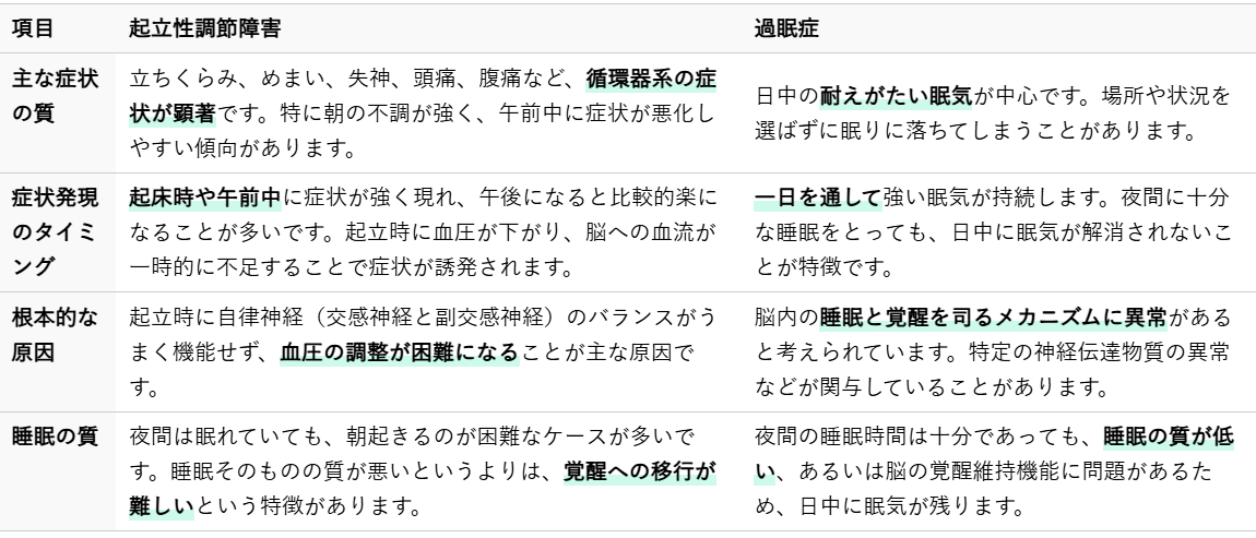 起立性調節障害と過眠症は、どちらも日中の眠気や倦怠感、集中力の低下といった共通の症状が見られるため、混同されやすいことがあります。しかし、その根本的な原因と症状の現れ方には明確な違いがあります。