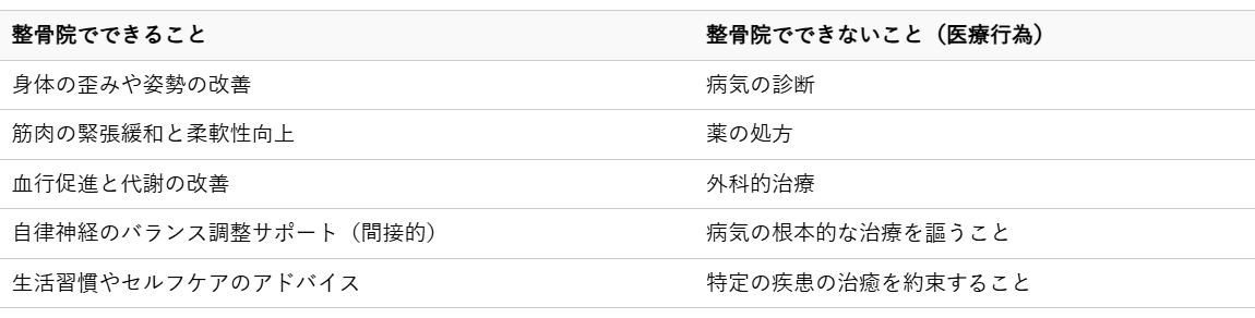 整骨院は、起立性調節障害や過眠症そのものを診断したり、治療したりする医療機関ではありません。しかし、これらの症状に付随する身体の不調に対して、身体の専門家として多角的なアプローチを提供することができます。