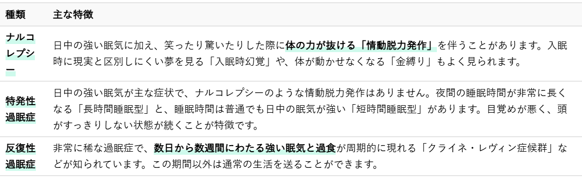 - 夜間の睡眠時間が非常に長く、10時間以上眠っても日中の眠気が解消されない